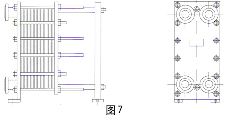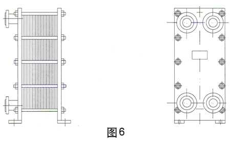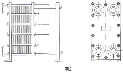 板式換熱器在裝配形式上又可分為不懸掛式(圖6)和懸掛式(圖7),不懸掛式換熱器不帶支柱,地腳板直接焊在二個夾緊板的下端,它適于重量較小的小型號的換熱器,以便在拆裝時能搬動。懸掛式換熱器帶有支柱,它拆裝時可在原位不動,活動夾緊板和換熱板片懸掛在上導桿上,可以移動,換熱板片可以拆下和裝上,較大型號的換熱器一般采用懸掛式的,以便于拆裝維修。