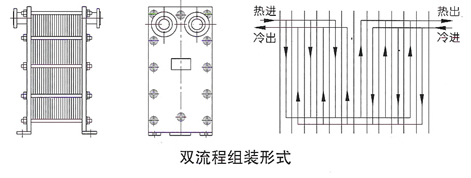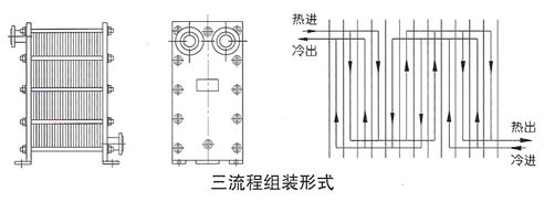 當兩種介質的流量不同且大致為2:1且不易裝配成雙流程時,可選擇該類型的換熱器。它適用于小區集中供熱,一般一次網的熱水流量較小,二次網用戶取暖供水的流量較大的場合。