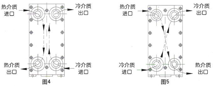 板式換熱器根據介質的溫差和流量,可以裝配成單流程、雙流程、三流程以及多流程的形式。單流程是指介質在換熱器內流過一個流程,雙流程是指介質在換熱器內折返流過兩個過程,依次類推,各種流程的外形圖和其流程示意圖如圖3。當采用多流程時,換熱器的四個接口就不能在同一側的夾緊板上,進出口要位于前后兩個夾緊板上。